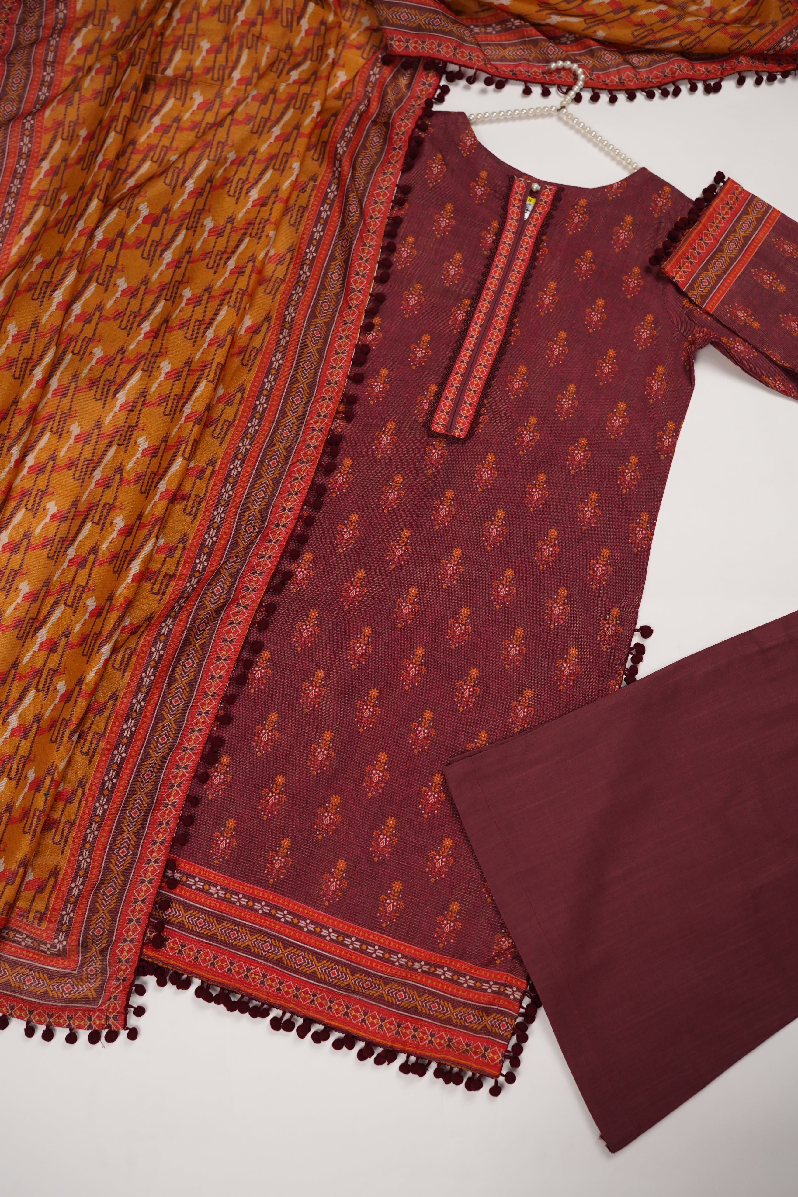This khaddar ladies suit is crafted for style and warmth, perfect for winter wear. Featuring a soft yet durable texture, it includes a beautifully tailored shirt and matching trousers. The breathable fabric ensures comfort, while the rich design adds elegance, making it suitable for both casual outings and semi-formal gatherings.